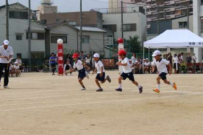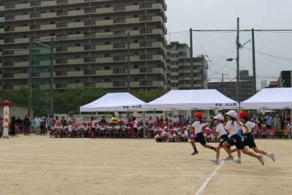 小学校で初めての運動会。1年生はやる気満々です!ゴールに向かって力いっぱい走りました。