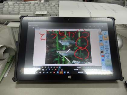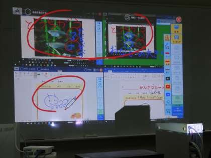 放課後、本年度から新しく導入したタブレット機器について、外部から講師を招いて研修会を行いました。今回の研修では、学習の中での子どもたちの“気付き”や“考え”を瞬時に視覚化して発表する方法や、複数台のタブレットで撮影したものを、同時タイミングで比較したり、画面を重ね合わせて多重化したりする動画比較の方法を講習しました。