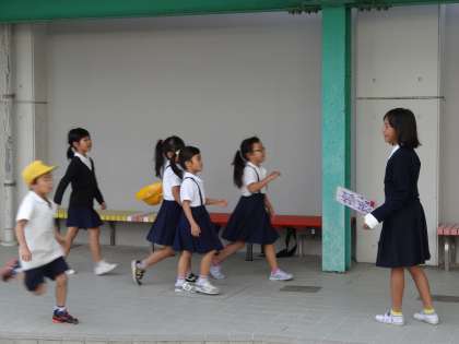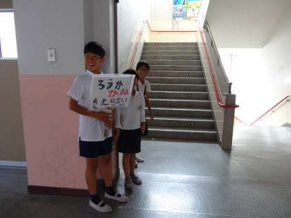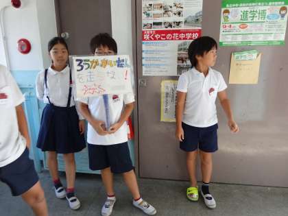 今週から6週間、校内の安全歩行についての取り組みが始まりました。すべての学年が、週替わりで“正しい歩行が行われているか”や“右側通行などのルールが守られているか”など、啓発活動を行い、安全についての意識を高めていきます。最初は5年生が担当しました。それぞれの階段や中庭に立ち、「廊下を走らないようにしましょう!」や「右側通行をしましょう!」など、他学年の児童に呼びかけをしました。