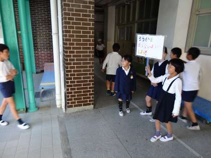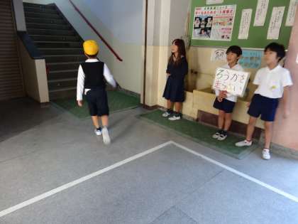 今週の校内の安全歩行についての取り組みは、2年生が担当です。それぞれの階段や中庭に立ち、「廊下を走らないようにしましょう!」や「右側通行をしましょう!」など、他学年の児童に呼びかけをしました。