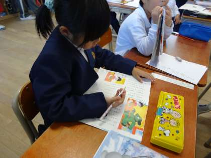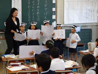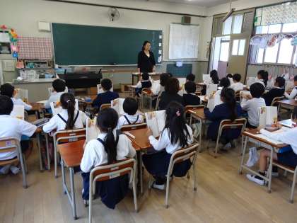 1年生は、国語科「サラダでげんき」で研究授業を行いました。お母さんのためにサラダを作ろうとする“りっちゃん”の前に、動物たちが次々と出てきて、サラダに入れる材料とその効果を教えるお話です。その中で、“すずめ”と“あり”がしたことや、そのときの場面の様子を読み取っていきました。そして、“すずめ”と“あり”が、なぜ、その食材を薦めたのかを想像して、台詞を考えることができました。