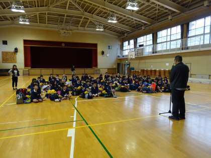 出発式を終え、学校をこれから出発です。保護者の方々が大勢お見送りに来てくれています。二日間の旅の始まりです。