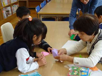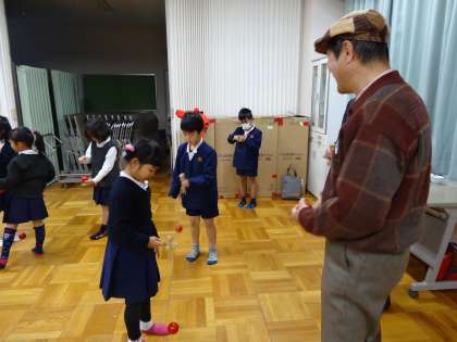 地域の「喜連喜友クラブ」の方々をゲストティーチャーに迎えて、昔から伝わる遊びを教えていただきました。“けん玉・コマまわし・おはじき・あやとり”など、コーナーに分かれてそれぞれ教えていただきました。はじめは難しかった遊びも、ていねいに教えていただいたので、子どもたちはすぐに“コツ”をつかみ、『できた!』と楽しそうな声がたくさん聞こえてきました。また、子どもたちからも、教えていただいた感謝の気持ちとして歌のプレゼントをしました。「喜連喜友クラブ」の方々も大変喜んでいただき、短い時間ではありましたが楽しい触れ合いの時間となりました。