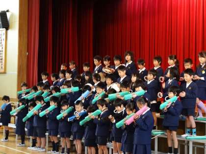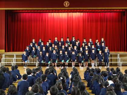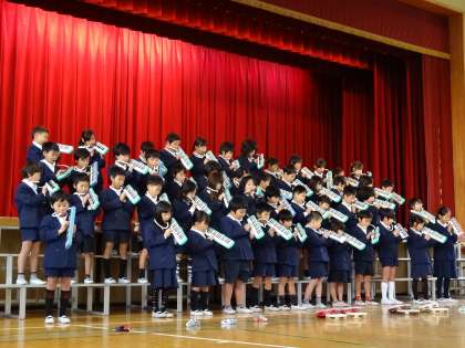 2年生が、児童集会で学年発表をしました。最初に、全員で「かたつむり」[きょうの おやすみ だあれ」「ともだち」という3作の詩を続けて朗読しました。とても長い朗読でしたが、最後まで声を合わせて発表することができました。また、「ドレミの歌」などの合唱や、「山のポルカ」などの合奏も、みんなでリズムを合わせて発表することができました。