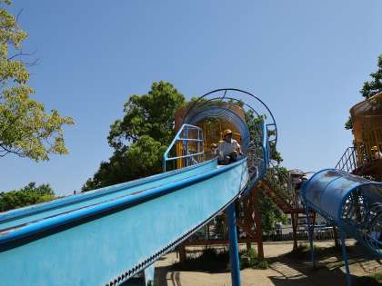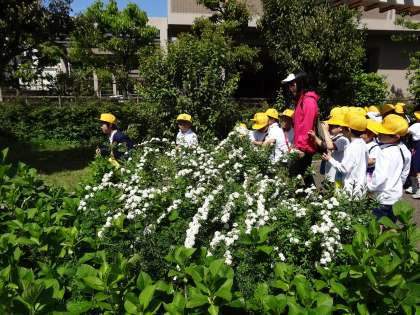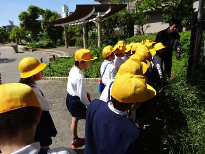 1年生は、出戸公園へ行きました。公園へ行くと木々は生い茂り、新緑の季節を肌で感じることができました。子どもたちは、草木の名前を質問したり、植物を間近に見たりするなど自然観察を行いました。また、観察の後、公園にある遊具で体を動かしました。