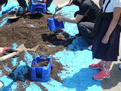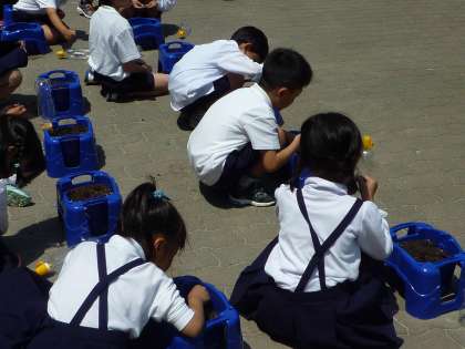 5月11日(木)の3時間目に1年生が中庭で朝顔の種植え作業をしていました。いつごろきれいな花が咲くのでしょうね。楽しみです。