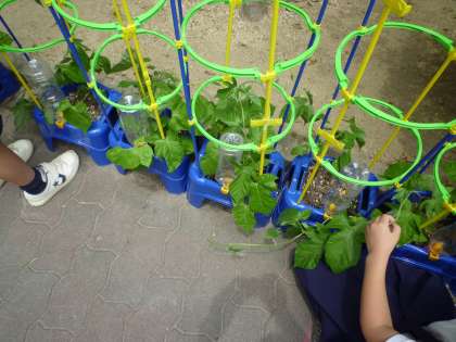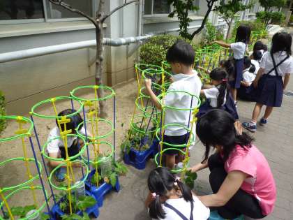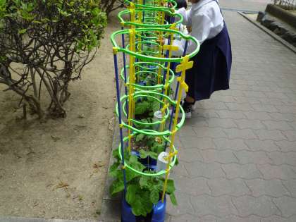 朝顔がますます成長し大きくなりました。とうとう、支柱を立てました。花が咲くのが本当に楽しみです。