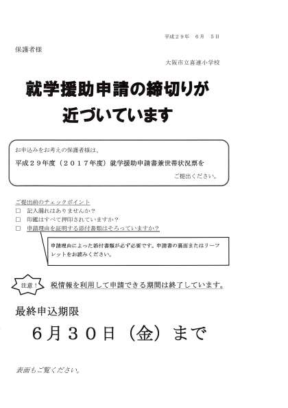 6月5日に保護者の皆様にプリントを配布し、お知らせしておりました“平成29年度の就学援助認定”の締切が迫ってきています。申請をお考えの方は、お気軽に喜連小学校事務室までご相談ください。また、申請を希望されている方は早急に書類の提出をお願いします。
