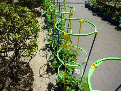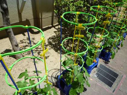 朝顔は、弦が伸び、支柱に巻きつきだしました。成長がとても速いですね。