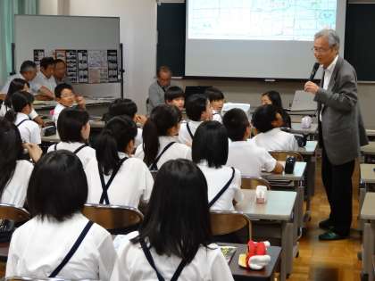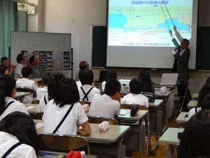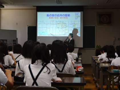 最初は、校区内の小字(こあざ)名から、その土地にまつわる歴史を教えていただきました。子どもたちは、自分たちが住んでいるところが昔は“ため池”だったり“田んぼ”だったりすることに驚いていました。また、校区についてもかなりの部分が池だったことにもとても驚いていました。