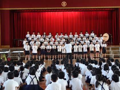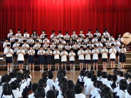 合唱では、美しい歌声が講堂に響き渡り、子どもたちも聞き入っていました。また、リコーダー演奏や合奏では、映画やドラマで使用された曲のイメージ通りに、清々しく、それでいて力強く迫力のある音が伝わってきました。6年生は、5月から休み時間などを使ってこの日のために練習してきました。そのがんばりが出ていて、とても良い学年発表になったと思います。