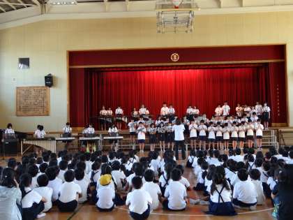 6年生が児童集会で学年発表をしました。内容は、合唱『宝島』・リコーダー演奏『ALWAYS 3丁目の夕日』・合奏『Deparyure』です。