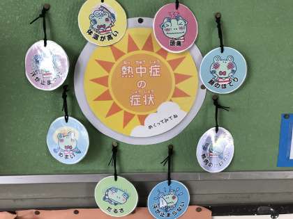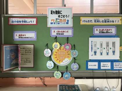 7月になり暑い日が続いています。7月の学校だよりで“熱中症”のことについてふれましたが、保健室前の掲示板でも、子どもたちに啓発を行っています。熱中症の症状を動くイラストを使って紹介したり、正しい水分補給について直感的に感じることができるようペットボトルを使って操作したりするなど、興味をもって取り組めるように工夫をしたものです。