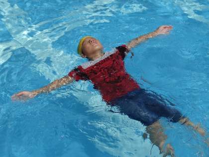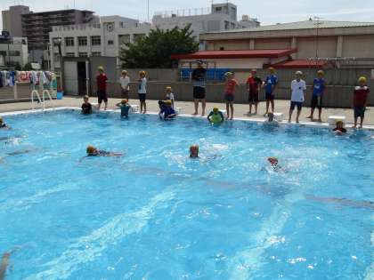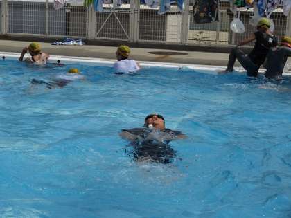まずは実際にプールに入り、体を浮かべることから始めました。そして少しでも浮力を得るために、ペットボトルを抱えたりして、救助が来るまで無駄な体力を消費しない方法をそれぞれが試しました。次に衣服を身に着けたまま25mを泳いでみました。しかし、衣服がダブついて思うようには体を動かすことができませんでした。少しの時間でしたが、水の事故の恐ろしさや事故にあったときにどうすればよいのかを知ることができました。