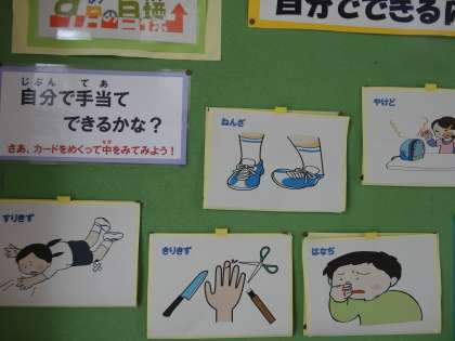 9月の保健目標は“自分でできる応急手当てをおぼえて使えるようにしましょう”です。