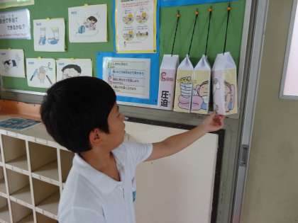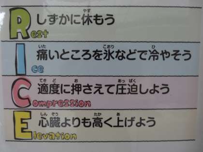保健室前の掲示板には、カードをめくって正しい応急手当の方法を学んだり、4つの絵合わせで、手当の基本“RICE”を確かめたりすることができるように掲示の工夫が行われています。