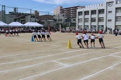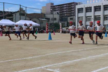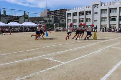 チームワークを大切にしてコーンの周りを回りました。赤組、白組ともに力を合わせてがんばりました!