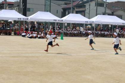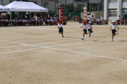 小学校で初めての運動会。1年生はやる気満々です!ゴールに向かって力いっぱい走りました。