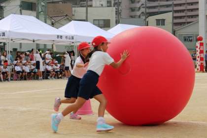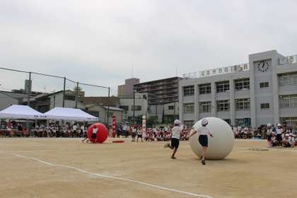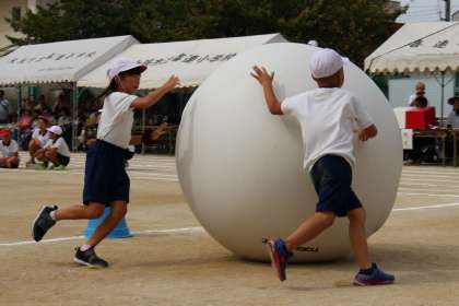 それぞれのペアが協力して、身長ぐらいある大きな玉を転がしました。折り返し地点のコーンを倒さないように、うまく大玉を転がすことが勝負の分かれ目となりました。赤組も白組も、最期まで、がんばってゴールをめざすことができました。