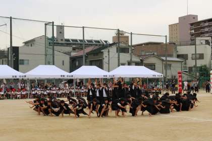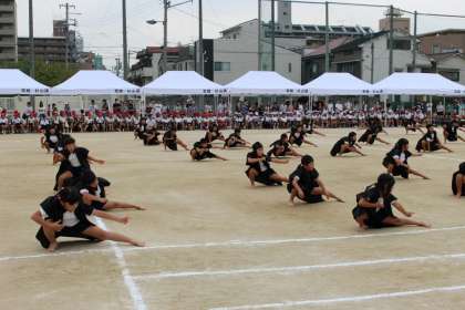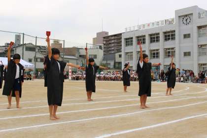太鼓の『ドン!ドン!ドン!』の音がすると子どもたちが入場し、かけ声とともに構えた後、迫力のある力強い演技が始まりました。ソーラン節を体全体を使って表現し、一生懸命におどった4年生、とても格好良かったです。