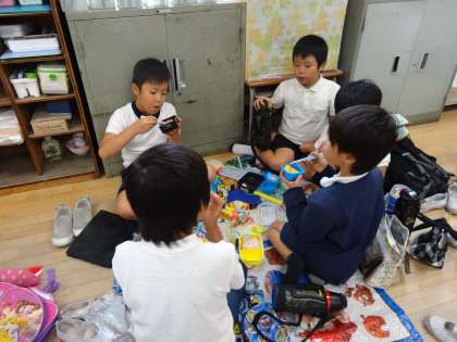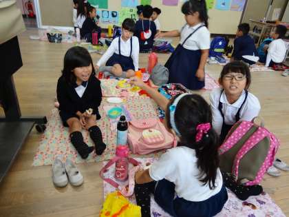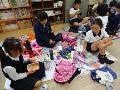 2年生は秋の遠足をとても楽しみにしていましたが、本日は雨天のため中止となってしまいました。そのため、お弁当は教室で食べることになりました。大泉緑地ではないけれど、みんなで食べるお弁当はどこで食べてもおいしいです。