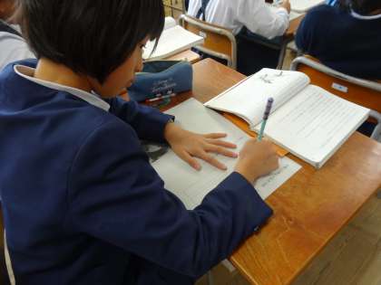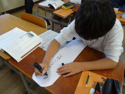 本校では、平成28年度より国語科を研究教科として「確かな読みの力を育成する国語教育をめざして 〜基礎・基本の定着〜 」をテーマに研究を進めています。基礎・基本の力をつけるために、5年生は「大造じいさんとがん」という単元において、『(ポップを作るために)大造じいさんの心情の変化を読み取ろう』というめあてをもって授業研究を行いました。物語文を読み、大造じいさんの気持ちが表れている表現に線を引き、(大造じいさんのがんに対する)気持ちが変わったきっかけとなる行動をワークシートに記入していきました。また、大造じいさんの心情を想像し、大造じいさんが残雪にどのような言葉をかけたのかをワークシートに書き込むことができました。