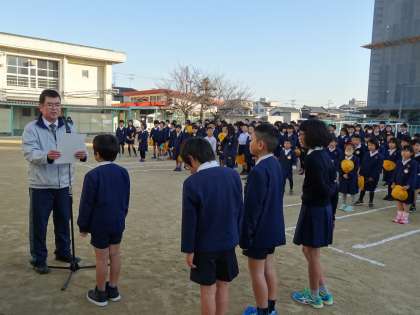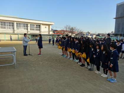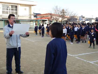 本日の児童朝会では、防災図画・読書感想文コンクールにおいて入賞したそれぞれの児童と、キックベースボールの表彰を行いました。校長先生よりその成績を称え、表彰状が渡されました。