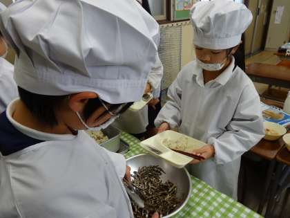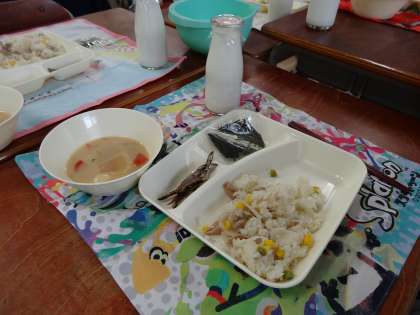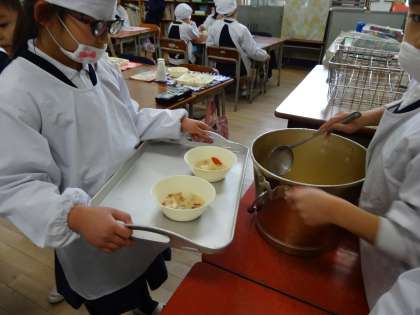 楽しみにしていた給食が始まりました。本日は、正月の行事献立で、れんこんのちらしずし・雑煮・ごまめが出ました。みんなで食べる給食は、とてもおいしいです。