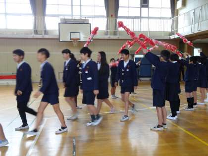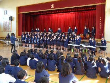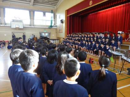“6年生を送る会”を本日行ないました。6年生を送る会では、6年生が花のアーチを通って入場してきました。6年生が席に着くと、1〜5年生がそれぞれ6年生に対してメッセージや歌をプレゼントしました。また、6年生からも合奏のプレゼントがあり、とても素晴らしい演奏でした。