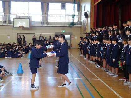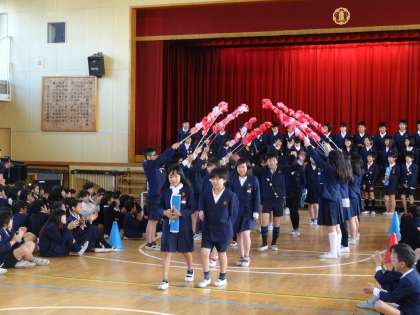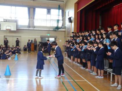 歌やメッセージを披露した後は、贈り物の贈呈をしました。在校生からは、寄せ書き集会で作った寄せ書きを1年生が代表して6年生に贈りました。6年生からは、各学年の代表に手作りの雑巾が手渡されました。会の最後は、6年生が花道をくぐり退場していきました。