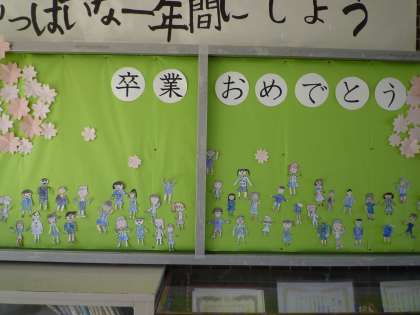正門の掲示板も、3月に入り卒業バージョンになっていました。