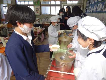 1〜5年の各学級で、6年生とのお別れ交流給食を行いました。それぞれの学級では、一緒に配膳をしたり、給食の話で盛り上がったりと交流を深めました。どの給食の班もとても楽しそうな雰囲気でした。