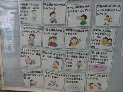 保健室前の掲示板では、1年間の健康チェックということで、“からだ・せいけつ・リズム・こころ”の4領域で、今の生活のままでいいのかチェックできるようになっていて、すべての質問パネルが裏返るとメッセージがあらわれます。子どもたちは、どんなメッセージがあらわれるのか期待しながら、それぞれのパネルを裏返していました。