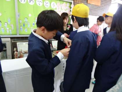 登校時、卒業生は5年生から胸花をつけてもらいました。いよいよ卒業式が始まります。