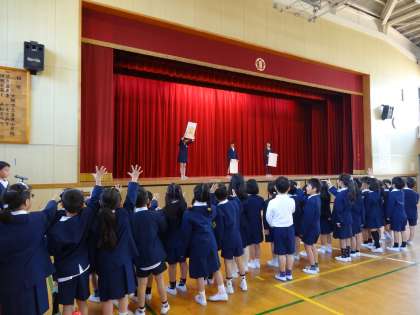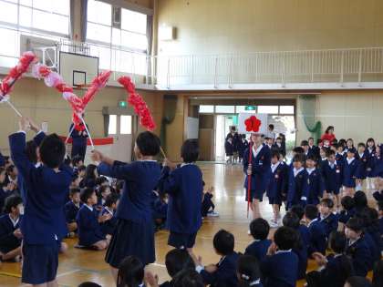 お祝いのことばや校長先生からのお話、ゲームがあり、1年生にとって、とても楽しい会になりました。