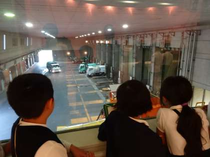 4年生は、大阪市環境局平野工場へ社会見学に行きました。最初に映像で工場の設備の説明を受けた後、実際に施設内を見学していきました。子どもたちが最初に見学したのは「ごみピット・ごみクレーン」です。学校の25メートルプール約40杯分の容量があるごみピットに集められたごみを、約11tのごみを持ち上げることのできるごみクレーンで運び出す作業を見たときは、子どもたちから感嘆の声が上がっていました。その後、「焼却炉」や焼却炉から出た灰を運び出す「灰クレーン・灰ピット」を見学しました。また、収集車が集めたごみを一度に集積するプラットホームを見学したときには、その施設の大きさにみんな驚いていました。