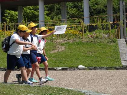 最初の活動として、班ごとにオリエンテーリングを行いました。地図に記されている問題の答えを、みんなで協力しながら見つけていきました。どの班も、時間いっぱいまで活動することができました。