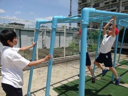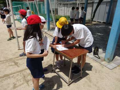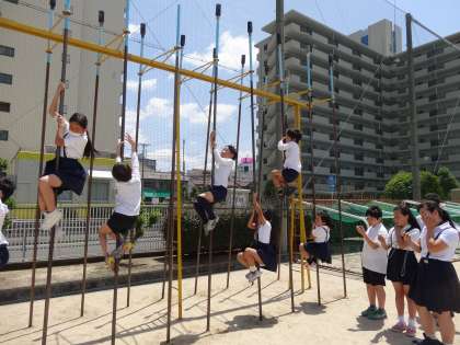 運動する機会をつくるとともに、体力を高めるための取り組み「SASUKEチャレンジ」が本日から始まりました。本年度も運動委員会が中心となり、3時限目後の休み時間と朝の時間に行います。3年生は“うんてい”で、4年生は“のぼり棒”で体を動かしました。それぞれの遊具には、初級・中級・上級の3段階の設定があり、子どもたちは自分の力に合わせて挑戦できます。3・4年生の子どもたちは、チャレンジ用紙を持ち、クリアしようとがんばっていました。