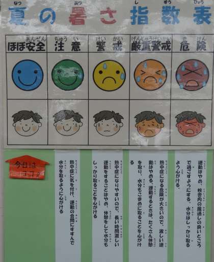 最近、蒸し暑い日が続いています。学校では、職員室の入口横に暑さ指数をはり出しています。毎日送信されてくる注意報には、3時間おきに「警戒・厳重注意・危険…」などの暑さ指数が記されており、子どもたちには、この指数と“夏の暑さ指数表”を照らし合わせて、今、運動場で遊んでも良いのかを知らせています。また、並行して熱中症予防の警鐘も行っています。