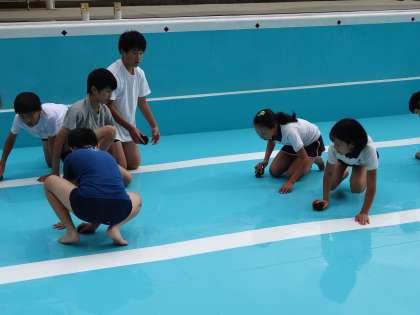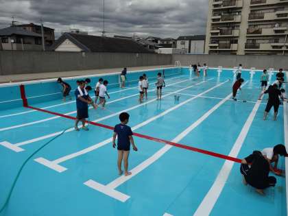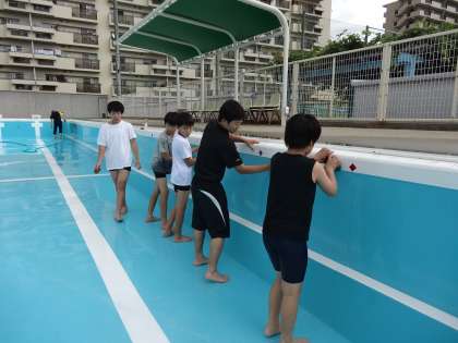 来週からいよいよプール水泳活動が始まります。放課後、そのための準備として、教職員と運動委員会の児童でプール清掃を行いました。清掃作業では、プールの床面や側面を丹念にブラシで洗っていくことで最後はプールがピカピカになりました。作業後は、水を入れて完了です。プール水泳活動が始まるのが今から楽しみです。