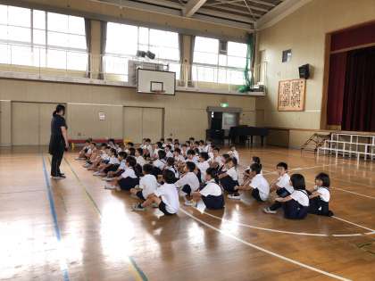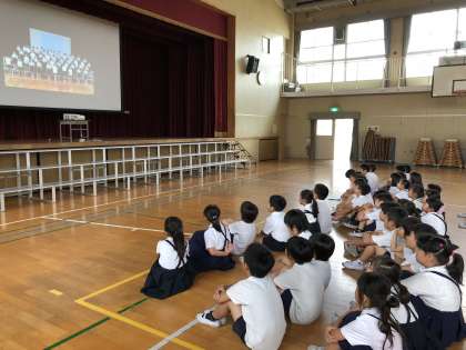 3年生は、平和学習で“ちいちゃんのかげおくり”に取り組んでいます。今回、自分たちの発表の様子を動画に撮り、どのような感じなのかスクリーンに映して確認しました。