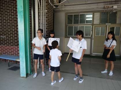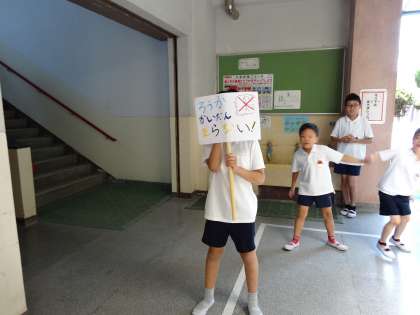 子どもたちによる学校生活を良くするための運動を始めました。トップバッターは、6年生による“正しい歩行キャンペーン”です。20分休みの時間に廊下に出て、廊下を走らないようにプラカードを持って下級生に対して声かけをしていました。6年生は、今週この取り組みを続けます。