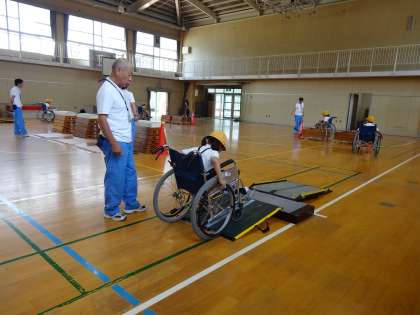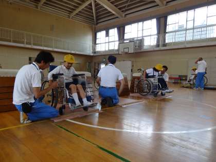 また、校舎内では、交代で車いすを押しながら校舎内を歩きました。この学習で、障がいがある人や介助している人などのご不便を身をもって知るとともに、それらの方々が少しでも快適に生活できるようなユニバーサルデザインの社会にしていくことの大切さに気付くことができました。