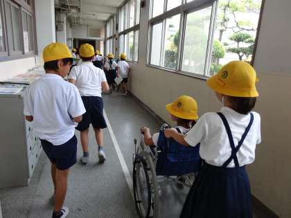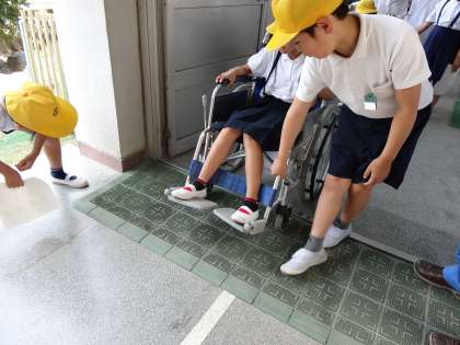 校舎内を車いすで移動している様子です。スロープがない場所や段差のあるところなどを移動しました。