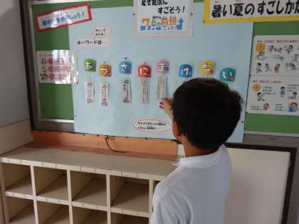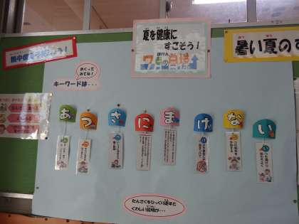 最近、蒸し暑い日が続いています。学校では、職員室入口横の暑さ指数のはり出しと並行して保健室の掲示板でも熱中症予防の警鐘も行っています。