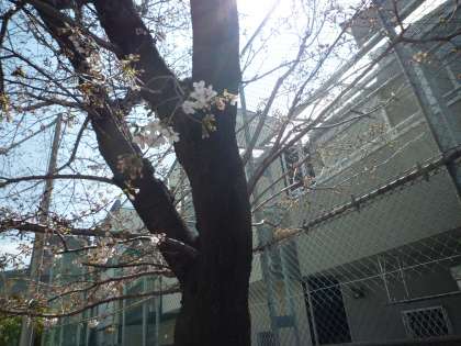 図書室前の桜が咲いていました。暖かい日が続いています。満開になる日も近いかな。