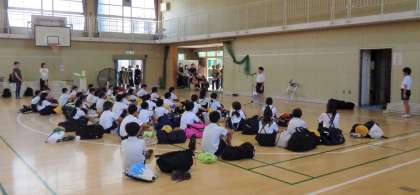子どもたちは、大自然の中で、たくさんの思い出をつくることができたと考えます。保護者の皆さまには、保護者の皆さまには、持ち物の準備や健康管理等にご協力いただき、ありがこうございました。合わせて、ご多用の中、見送り・お迎えいただきました皆さま、重ねて、感謝申しあげます。(写真:帰校式の様子)
