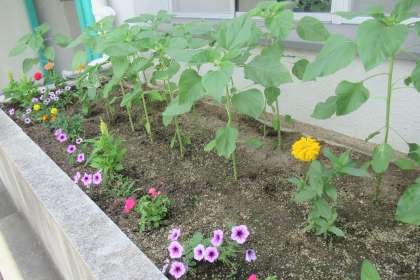 本校玄関の花壇は、北向きのために日当たりが良くありません。でも、ひまわりは、7月10日の時点で、窓枠の下枠にかかる高さだったのが、2週間で窓枠の上枠を越えるまでに成長しています。
