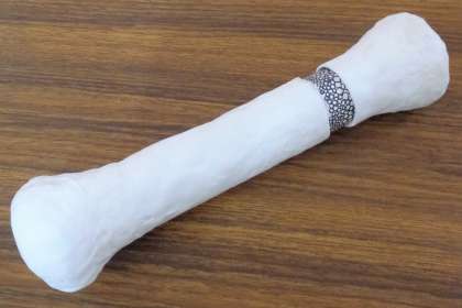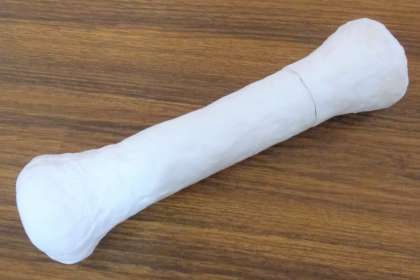 成長期の子どもの骨はやわらかく、骨の両端に「骨端線」という所があり、その部分の細胞が増えることで、背が伸びます。保健室の先生が、手づくりの骨の模型(写真)を使いながら、説明しました。子どもたちは、熱心に聞いていました。