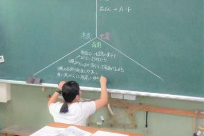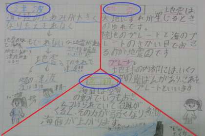 5年生は、思考ツールの一つ、「Yチャート」を逆さにしたものに、「地震」「津波」「高潮」が発生するしくみ等を調べ、まとめました。